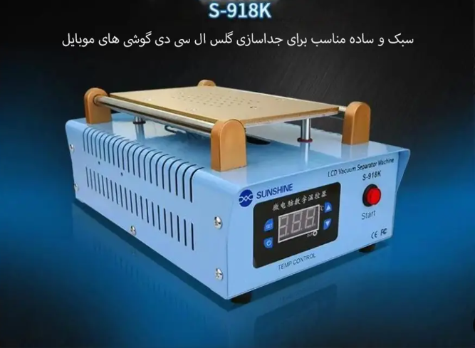 دستگاه سپراتور سانشاین sunshine s-918k یا همان جداکننده ال سی دی، وسیله ای برای جدا کردن ال سی دی و گلس از گوشی می باشد. این دستگاه از ویژگی های زیر برخوردار می باشد