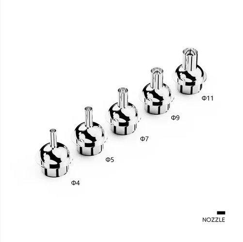 دارای 5 عدد نازل در سایزهای مختلف و پایه مخصوص نصب و تعویض نازل بر روی بدنه دستگاه میباشد.